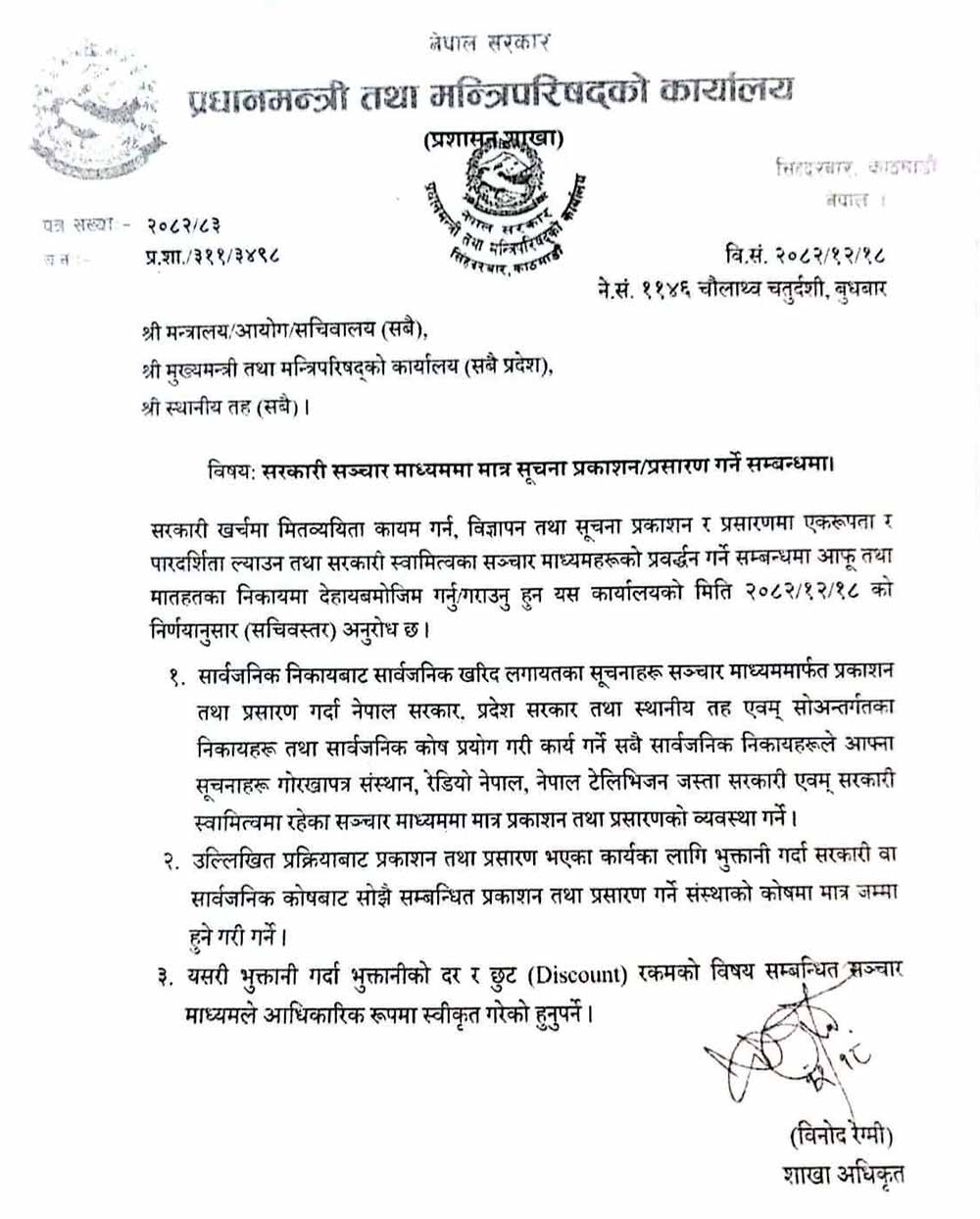 प्रधानमन्त्री तथा मन्त्रिपरिषदको कार्यालयले सरकारी खर्चमा मितव्ययिता कायम गर्न, विज्ञापन तथा सूचना प्रकाशन प्रशारणमा एकरुपता र पारदर्शिता ल्याउन सरकारी स्वामित्वका सञ्चारमाध्यमहरुको प्रवर्द्धन गर्न आफू तथा आफू मातहतका निकायहरुलाई सर्कुलर जारी गरेको छ ।