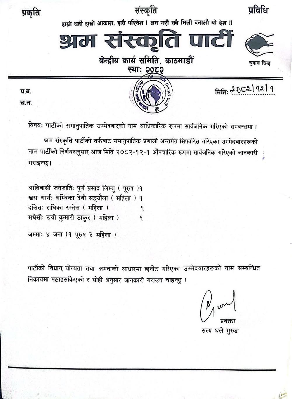 जस अनुसार पार्टीले आदिवासीबाट पूर्ण लिम्बू, खस आर्य महिलाबाट अम्बिका देवी सङ्ग्रौला, दलितबाट राधिका रम्तेल र मधेसीबाट रुबी कुमारी ठाकुरको नाम छ्नौट गरेको हो ।